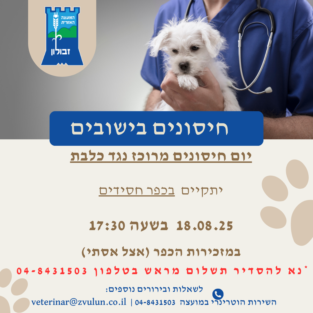 כדי להגיע לחיסון כלבת יש לתאם בטלפון/במייל מראש. למען בריאות הציבור- הסדרת הרישום וחיסון הכלבים נגד כלבת - יולי 2025