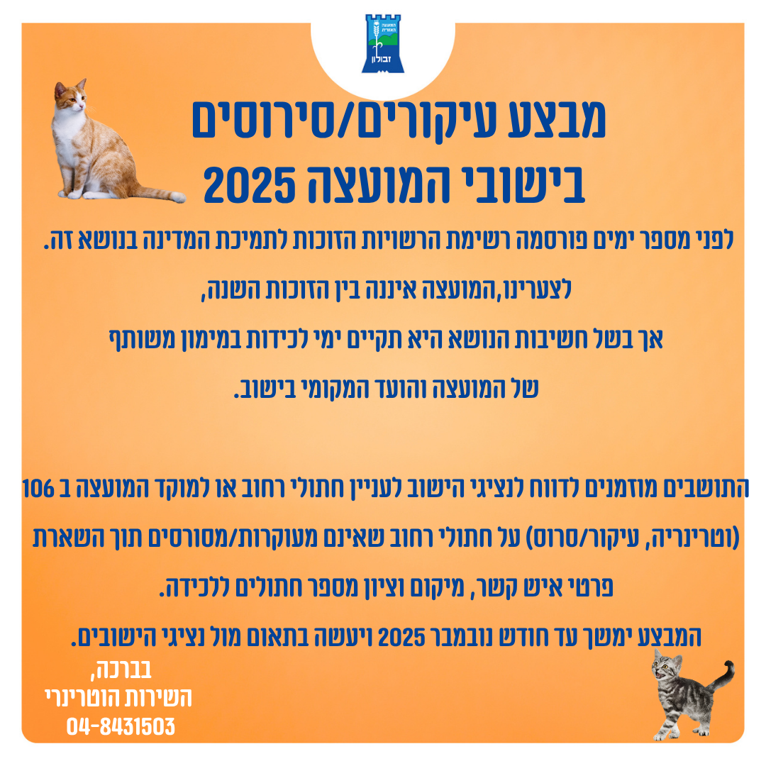לשאלות, ניתן לפנות אל שירות הוטרינרי של המועצה בטלפון 048431503 או במייל